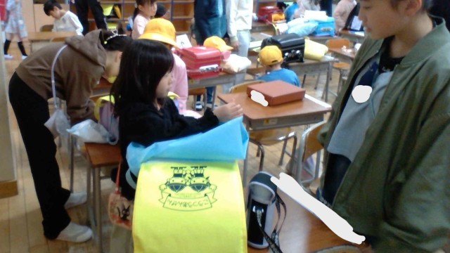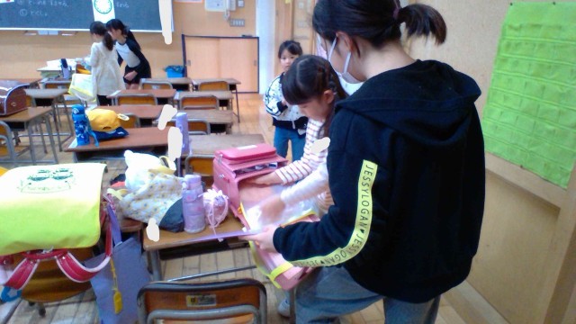 登校後、朝の準備をしている様子です。1年生は黒板を見てやるべきことを確認したり、分からないことを6年生に聞いたりして朝の準備を行いました。6年生も、1年生の様子を見て必要に応じて声を掛けたり手伝ったりしていました。
