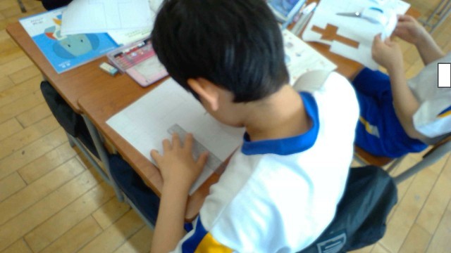 算数科の授業では、直方体と立方体を展開図を書いて作り、どちらの体積が大きいか考えました。