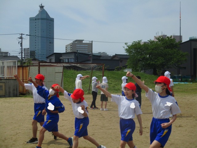 運動会に向けて、応援練習をしています。今日はグラウンドで、入場から退場までの動きを含めて練習しました。