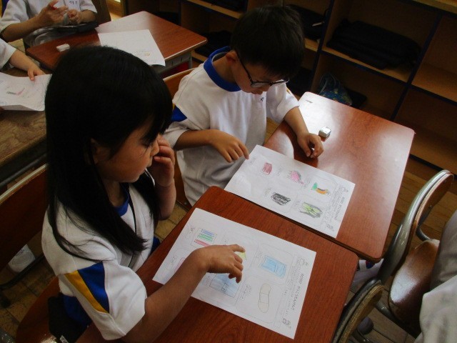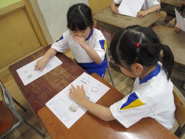 今日は、学校探検をして見付けたものを紹介し合いました。絵と言葉でペアさんに伝えることができました。
