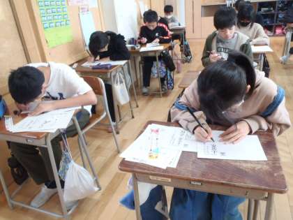 書写の時間には、筆ペンを使って文字を書く学習をしています。担任宛ての年賀状という設定で、はがきの表や裏を、文字の大きさや配列を意識しながら書きました。子供たちは、一文字一文字、心を込めて丁寧に書いていました。「筆ペンを初めて使ったけれど、楽しい」「書き心地がいい」「家で書く年賀状も筆ペンを使おう」等の声が聞かれました。