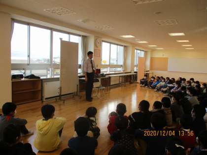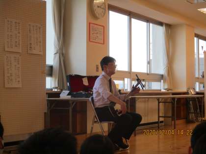 「日本の音楽に親しもう」の学習では、奥田小学校でおわらに携わっている先生をゲストティーチャーとして、富山県に伝わる「おわら風の盆」について学びました。先生からおわら風の盆の歴史や特徴について教えていただき、質問にも答えていただきました。独特な言い回しのおわらの代表的な歌を歌った後、先生の三味線の生演奏があり、初めて聴く音色に子供たちは聴き入っていました。