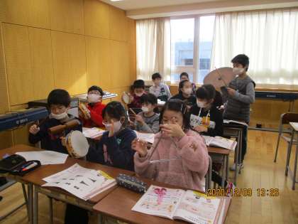 タンブリン、ウッドブロック、カスタネット、クラベス、トライアングル、すず等の音色の特徴を感じ取って、強弱、音の重なり、反復、変化などを生かしてまとまりのある音楽をつくる学習に取り組ました。3人組で相談しながら音作りを楽しんでいました。