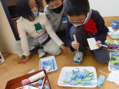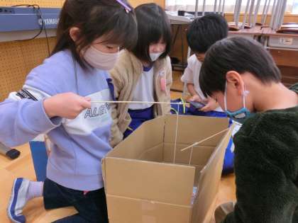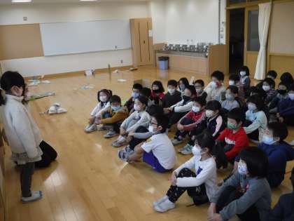 2年生が生活科の学習でつくった「うごくおもちゃ」で遊ばせてもらいました。招待状をもらったときからワクワクしていた1年生の子供たちは、教室に用意してあるおもちゃを見て、目を輝かせていました。同じなかよしグループの2年生がいる場所へ行き、ルールを教えてもらいながら活動を楽しんでいました。子供たちは、ゴムや風、磁石を使った様々な遊びを体験し、かっこいい2年生の姿を目に焼き付けていました。他学年と交流できた、よい経験になりました。