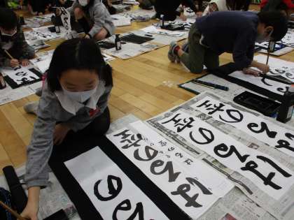 「『る』の形が難しいな」「『の』がうまく書けるようになったよ」等の声が聞こえてきました。初めて床で書き初め用紙に書いた子供たちは、これまでのように机の上で書くのとは違う難しさを感じつつも、少しずつうまく書けるようになっていくことがうれしいようでした。