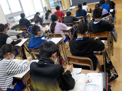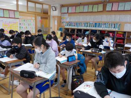 国語科では「今、私は、ぼくは」の学習をしています。6年間の小学校生活を振り返り、今、みんなに伝えたいことについて考えています。将来どんな自分になっていたいか、一緒に過ごした仲間に伝えたい思い等について、一人一人が今思っていることを書き出していきました。じっくりとこれまでの小学校生活を振り返る姿がありました。