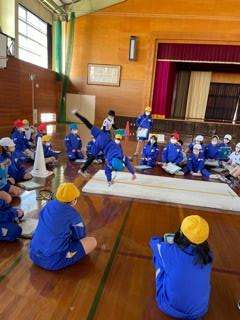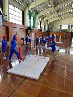 体育科でマット運動を学習しています。「マットに手・手・足・足の順番に手足をつけると、きれいに側転ができる」というこつを守って、一生懸命に練習に取り組んでいます。