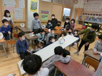 生活科の学習で、紙皿を2枚使ってコロコロ転がるおもちゃをつくりました。はさみやホッチキスの使い方に苦戦しながらも、自分のおもちゃが完成して転がると歓声を上げて喜んでいました。