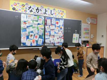 節分にちなんで、自分の中の追い出したい鬼を描きました。「すぐに怒っちゃうから、おこりんぼ鬼を追い出したいな」「忘れ物が多いから、忘れんぼ鬼を追い出したい」等、それぞれ自分を振り返って、鬼を描きました。