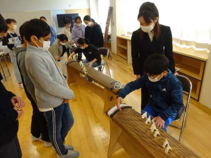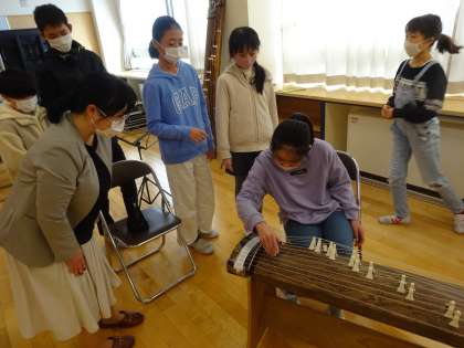 また、これまでの音楽の学習でつくってきた、2小節分の日本音階の旋律を、箏で奏でました。3、4人でつないだ演奏は、日本らしさを感じさせる風流な響きとなりました。 最後は、講師の先生方に直接指導をいただき、よりよい音を響かせ、その響きの美しさをを感じる子供たちでした。