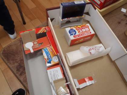 図画工作科の学習では、「ともだちハウス」に取り組んでいます。「遊具がいっぱいある豪華なおうちにしたいな」「部屋をいっぱいつくってあげよう」と、想像上の小さな友達のための家を楽しみながらつくっています。