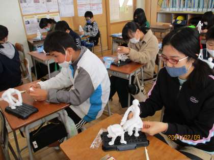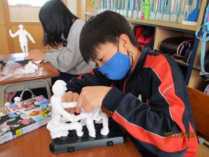 将来なりたい自分の姿を想像しながら、「12年後のわたし」の作品づくりに取り組んでいます。前回つくった土台に、今回は紙粘土を付けて形をつくっていきました。表情や髪型、服装等、細かい部分まで丁寧に表現しようと真剣な表情で取り組む子供たちでした。どんな仕事をしている様子なのかが、よく分かる作品になってきました。