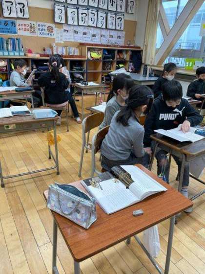 国語科で、「モチモチの木」を学習しています。「豆太は臆病だと思う。だってここに・・。」「ここの文章から、豆太は強いところもあると思うよ。」等、文章を基にどのような登場人物かを聴き合っています。