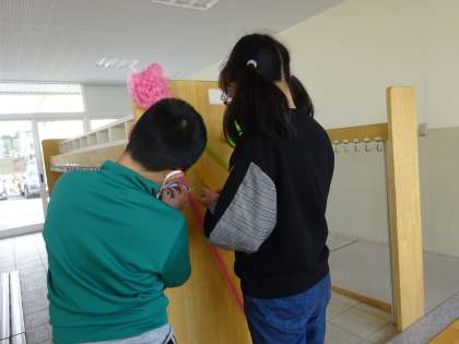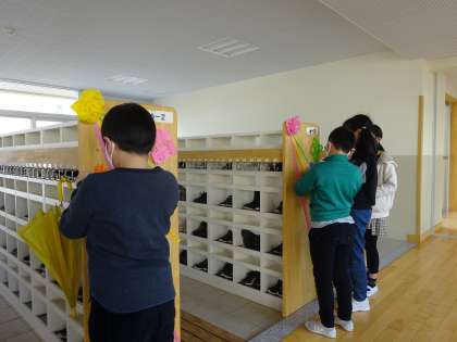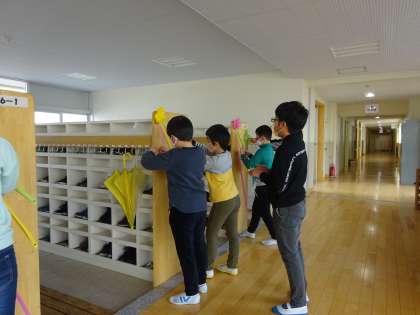 今日は、これまでにつくってきたお祝いの掲示物を玄関に貼りました。これから、さらに掲示物を貼る場所を広げ、お祝いの気持ちを6年生に伝えていきます。