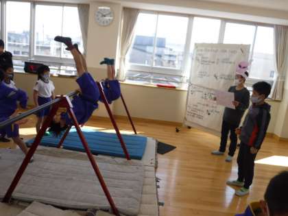 運動委員会の企画「Go to 鉄棒キャンペーン」に参加しました。「ツバメ」「前回り下り」「逆上がり」の3つの技を成功させることで、運動委員が演じるデビルにダメージを与えられます。難しい技ほどダメージを与えられることを知った子供達は、より難しい技に挑戦し、デビルを倒せるようがんばっていました。1組も2組も一番強いデビルを倒すことができ、満足していました。