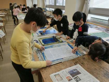 インクを版に濃くも薄くもなりすぎないようにまんべんなく伸ばし、ペアの友達と協力しながら紙を置いて刷り上げていきました。