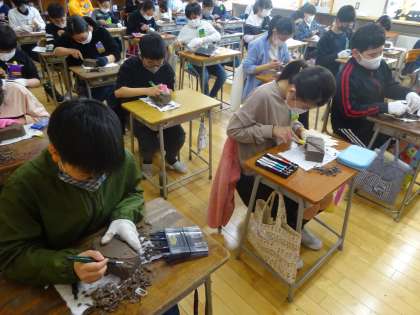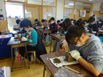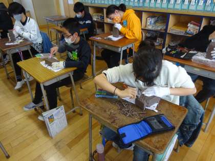 図画工作科で、子供たちは「彫刻」に取り組んでいます。「5年生の生活を振り返って」、「6年生になる来年に向けて」等、テーマを決めて、自分の心を表現しようとしています。間違えても修正できないという緊張の中で、集中して彫り進めました。どのような形になっていくのか、楽しみです。