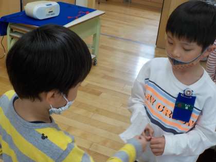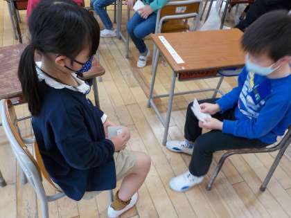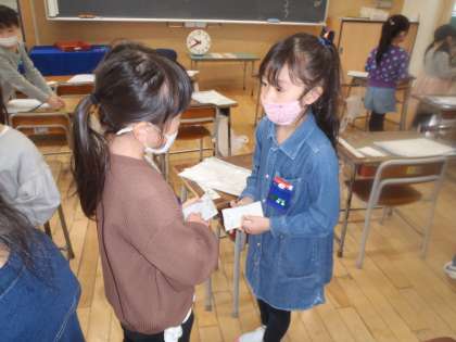 国語科「どうぞ よろしく」の学習で、名刺づくりをし、友達と交換しました。自分の名前を友達に覚えてもらったり、友達の名前を一生懸命覚えたりしようとする子供たちでした。