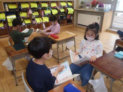 算数科では、教科書の写真をみて「右から何番目」「上から何番目」とペアでクイズを出し合いながら学習を進めました。