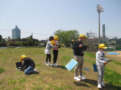 校庭や学校のまわりの植物や動物を探しに行きました。虫眼鏡を使って、色や形、大きさをじっくり観察したり、Chromebookを使って写真を撮ったりしました。「花びらの中ってこんな風になっているんだね」「ダンゴムシって足がいっぱいある」など新しい発見がいっぱいありました。