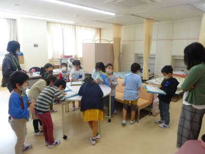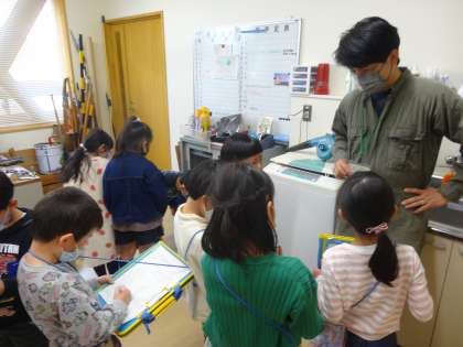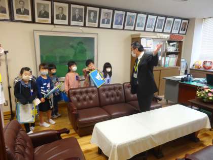 生活科「がっこうだいすき」の学習で、学校探検を行いました。チームごとに分かれ、校長室や保健室等へ行きました。どんな物があるか観察したり、先生に質問したりしました。