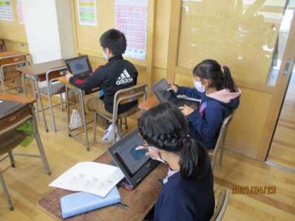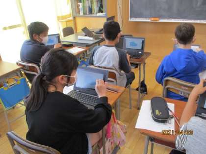 算数科の学習で、へこんだ立体の体積を求めました。直方体や立方体の公式を駆使して、正解に辿りつくための考え方を出し合いました。デジタル教材を用いて、立体を分解したり結合したりして立体がどのように構成されているか考えました。