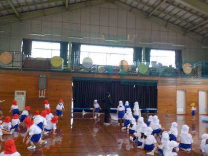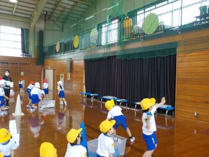 体育科の学習で、ボールを上へ高く投げる練習をしました。どうしたら高い的に当てることができるのか、友達のよい動きを見て、まねしようとしていました。