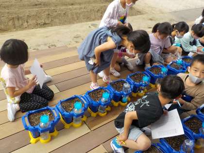 登校後、朝の準備が終わった子供から、あさがおの健康観察をしています。土が乾いていないかや変わった様子がないか等、自分のあさがおの様子をじっくりと見ています。芽が出るのを楽しみにしている子供たちでした。