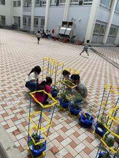 休み時間になると、野菜の苗の所に行き、一生懸命にお世話をしています。「大きくなったら、家族とみんなで食べたいな」「実ができたらお母さんと料理をする約束しているんだ」等、実ができることを心待ちしている様子でした。