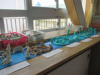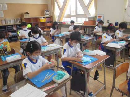 図画工作科では、ねん土を使って自分ならではの町をつくりました。「ネコが喜ぶネコタウンにしたい」「ぺちゃんこの形やがたがたの家等、おもしろい形の家がたくさんある町をつくりたい」など自分が行ってみたい町を楽しく想像していました。最後に自分の作品を写真に撮ってクロムブックに保存もしました。