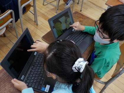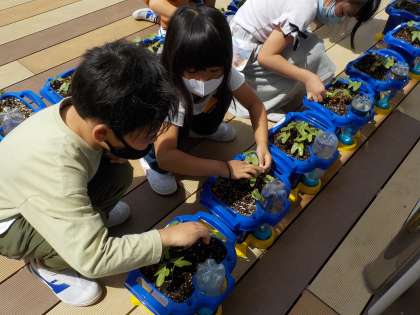 あさがおの観察の様子です。「僕の葉っぱには、線がたくさんあるよ」「前より大きくなって、数も増えたよ」等と、気付いたことを伝え合っています。毎日生長するあさがおにわくわくしている子供たちでした。