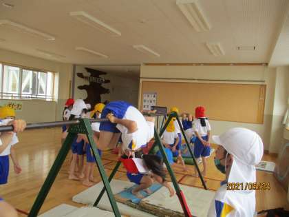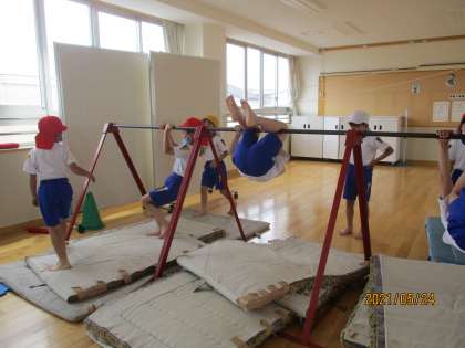 子供たちは、「チャレンジわざセブン」の鉄棒に挑戦しています。「ふとんほし」「こうもり」「ぶたのまるやき」「ちきゅうまわり」を頑張りました。