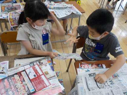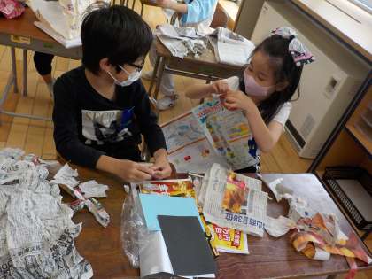 図画工作科では、紙を破ったりちぎったりして、紙の形から思いついたことを表す学習をしています。子供たちは破ったりちぎったりした紙を友達に見せながら「魚に見えるよ」「島みたいじゃない」等と、できた形を見付けていました。