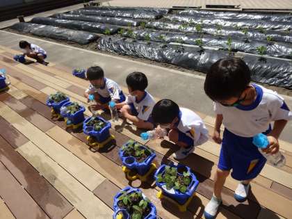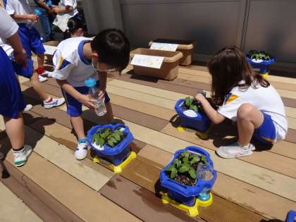 子供たちは、朝やふれ合いタイム、下校前に朝顔のお世話を積極的に行っています。成長を楽しみにしながら観察しています。