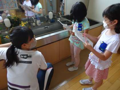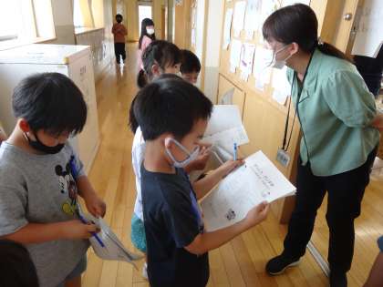 生活科の学習で、先生たちの名前を覚えようと、子供たちは朝やふれ合いタイムにインタビュー活動を行っています。初めは緊張していた子供たちも、話をするうちに笑顔になり、教室に帰ってきて「今日は3人の先生に名前を聞けたよ」「初めて話した先生がいたよ」と友達と伝え合っていました。