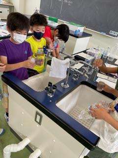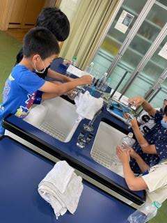 「家から持ってきた容器に、水は何dl入るのだろう?」という課題に対して、一人一人が予想し、1dlますで水のかさを量りました。「予想とぴったりだったよ」「20dlも入ったよ。とても大きいな」等、ペアと話しながら学習に取り組みました。