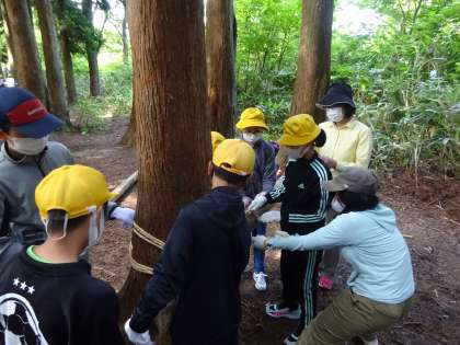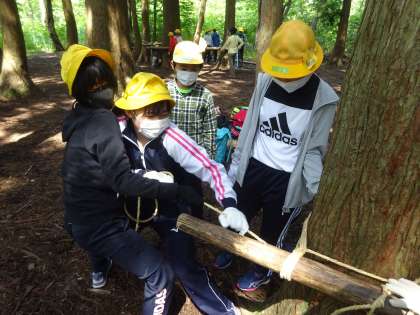 事前に学んだ角縛りを生かして、森小屋や遊び場をつくりました。どの木に丸太を付けるか班で相談したり、丸太を支え合いながら、仲間を意識して取り組みました。手早い作業で、全ての班が時間内に森小屋をつくることができました。