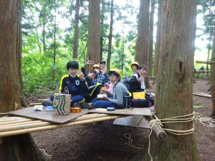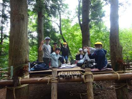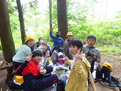 自分たちで作った森小屋の上に座って、昼食を食べました。床が少し不安定でも、自分たちがつくったものの上で食べるよさを感じている子供たちでした。