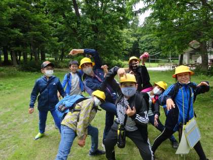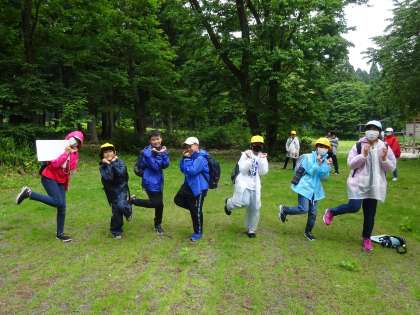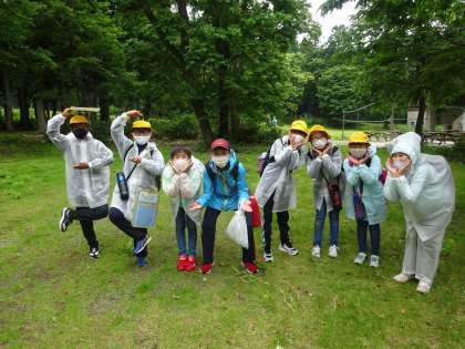 遊び場で遊んだ後、森小屋を片付けました。その後は、ポイント探しです。敷地内にある巣箱を、地図を頼りに見付けていきます。先生が立っているポイントもあり、そこでは出された課題をこなさなければなりません。先生に「じゃんけんで全員勝たないといけない」や、「学年目標を全員でそろえて言う」、「おもしろいポーズで写真に写る」などがありました。途中、雨が降ってきましたが、かっぱを来て雨に負けずにポイントを探し歩きました。