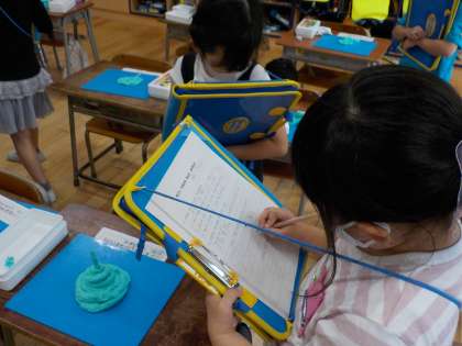 図画工作科「ひもひもねんど」の学習をして、友達の作品の鑑賞をしました。友達の作品を見ながら粘土でいろいろなひもがつくれることや、ひもを使って形をつくるおもしろさに目を向けていました。