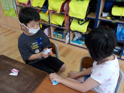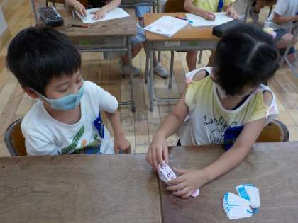 計算カードを使って計算の練習をしています。素早く計算することができるように家でも練習していると話す子供もいました。