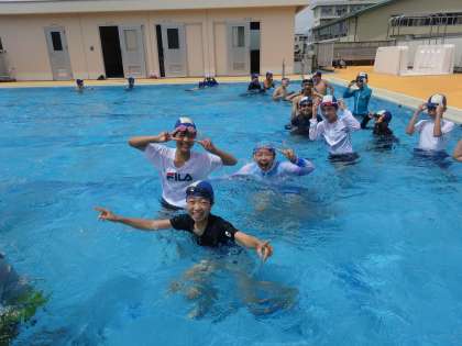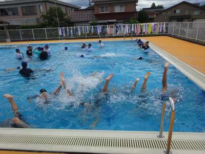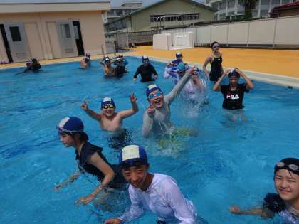 自由時間には、友達と25mを競争したり、泳ぎ方を教えてあげたりする姿が見られました。また、シンクロに挑戦する子供も現れました。久しぶりの水泳学習を楽しんだ子供たちです。