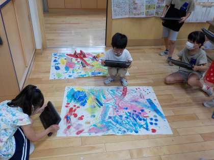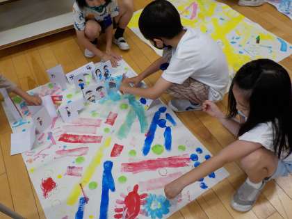 先日図画工作科の学習でした「コロコロ ぺったん」の世界に、「おってたてたら」の作品を飾りました。「僕たちは花火の世界にだから、たくさんの人がいて、花火大会みたいな感じにしよう」や「海の生き物をたくさんおって立てよう」等と、自分たちが考えた世界に合わせた作品をつくることを楽しんでいました。