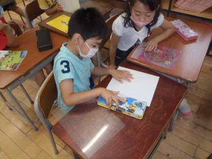 「どちらがながい」の学習を進めています。身近な鉛筆、プリント等の長さを比べるにはどんなことに気を付けたらいいかや、どんな方法があるか等、ペアの友達とたくさん考えました。長さ比べに興味をもっている子供たちです。