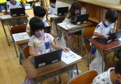 今日は、Chromebookのmeet機能を使う練習をしました。友達や先生の顔が画面で見え、とても楽しそうでした。夏休みには、Chromebookを使っての課題もあるので、一人でも使うことができるよう、使い方の練習を頑張っています。