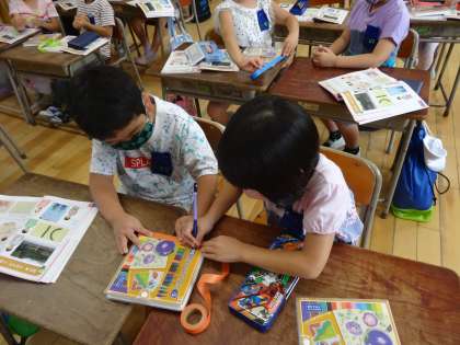 算数科の学習では「ながさくらべ」を行っています。今日はいろいろなものの長さを紙テープに写し取って、ものの長さを比べました。「色鉛筆ケースの縦と横の長さは同じだと思っていたのに、比べたら違ったよ」「もっと大きなものの長さを比べてみたいな」と意欲的に活動に取り組んでいました。