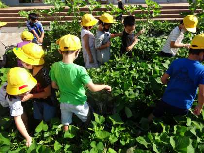 5月に植えたさつまいもの苗がぐんぐんと生長しています。夏休みに入る前に草むしりをしようと、朝の時間を利用して畑の草むしりを行いました。さつもいもの葉と雑草を間違えないよう、友達と声をかけ合いながら頑張っていました。