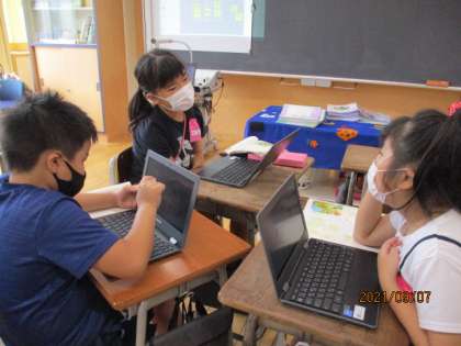 国語科「山小屋で三日間すごすなら」の学習では、「山小屋で三日間過ごすことになり、普段子供だけではできないことをして自然と触れ合うなら、どんな物を持っていきたいか」について話し合いました。クロームブックのジャムボードを使って、出された考えをなかま分けして整理しました。どうしたら分かりやすく整理できるかを相談しながら意欲的に取り組む姿が見られました。