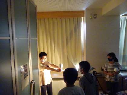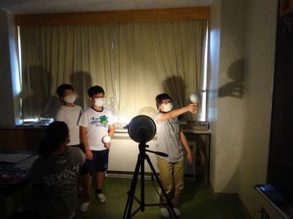月は形が変わっているのではなく、形が変わって見えていることを理解した子供たち。今日は、実際に月の満ち欠けがどのような理由で起こっているのかを、実験を通して考えました。ライトを太陽に、月をボールに見立て、自分は地球からの見え方を体感しました。実際に半月や三日月になって見える経験を通して、理解を深めた子供たちです。