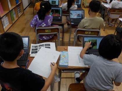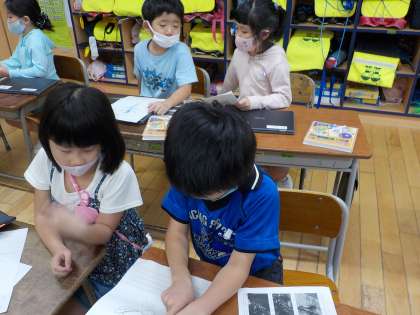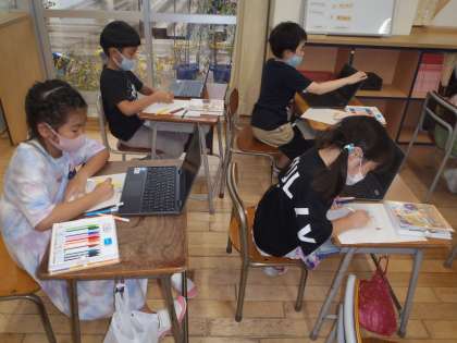 生活科「むし だいすき」の学習で、虫について調べています。中庭で見付けた虫の中から、調べたい虫を選び、chromebookを使って、色や形、体の特徴を調べていきました。